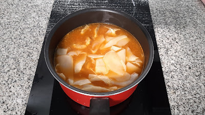 2. ตั้งหม้อใส่น้ำ ต้มน้ำให้เดือด ใส่พริกแกงเหลือง คนให้ละลาย ต้มจนกระทั่งเดือด ให้พริกแกงสุก ปรุงรสด้วยน้ำตาลปี๊บ เกลือ น้ำปลา และน้ำมะขามเปียก คนให้เข้ากัน